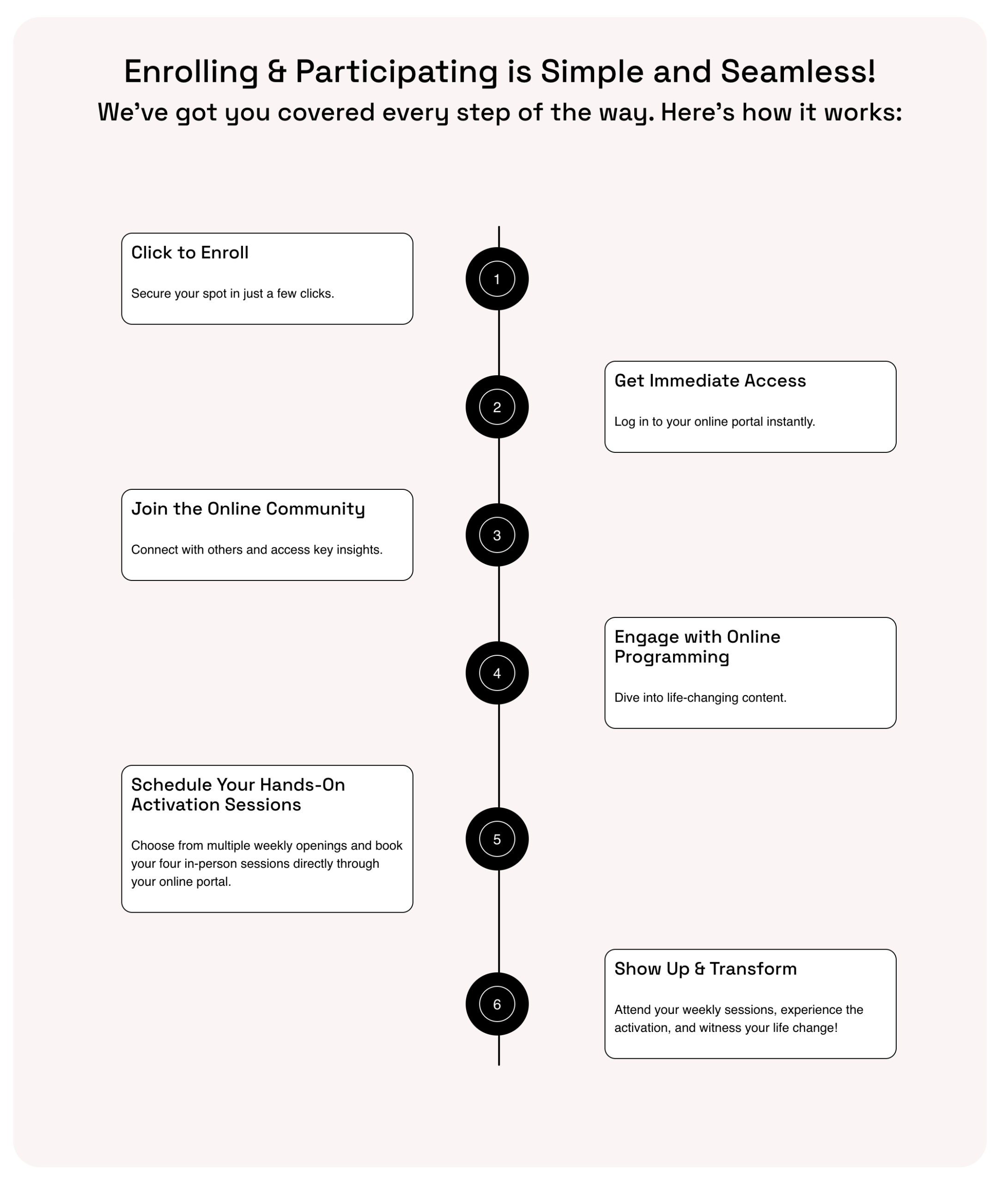 Your gentle, facilitator-led hands-on activation sessions are seamlessly complemented by an engaging at-home online program, designed to help you deepen your understanding, integrate your activation, and sustain your transformation long after your sessions. Through a combination of videos, audio guides, and written content, you’ll explore key concepts while interactive tools—such as images, polls, and surveys—help track your progress. As you advance, you’ll earn badges, making learning both rewarding and engaging. With the flexibility to progress at your own pace, this program ensures your journey is uniquely yours while enhancing every aspect of your hands-on experience.